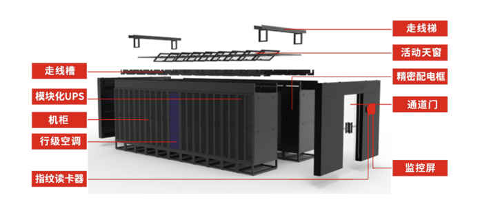 一体化集成:集成机柜系统、供配电系统、温控系统、机房管理、消防系统、综合布线等系统,高集成度设计,提供完整解决方案